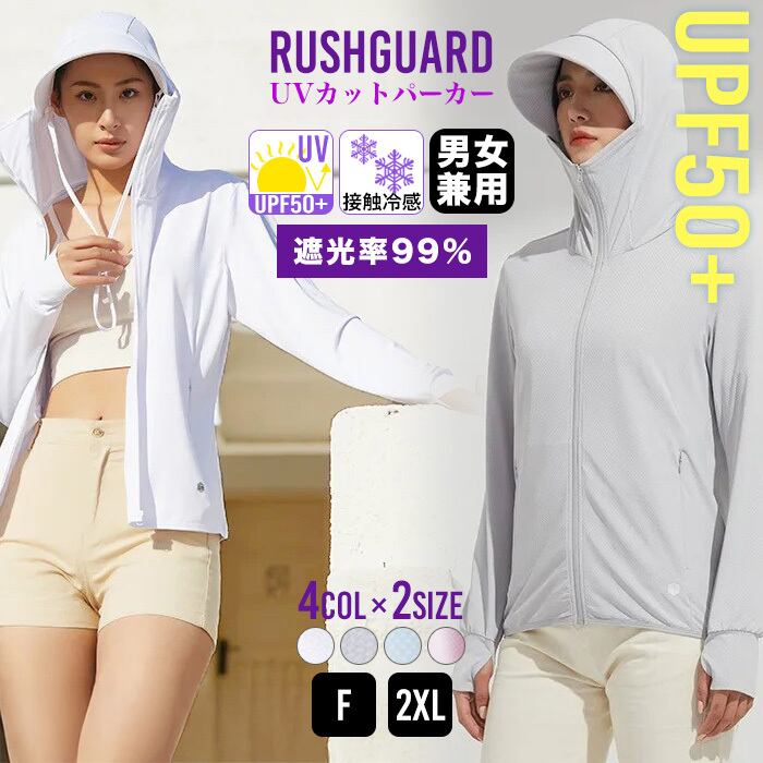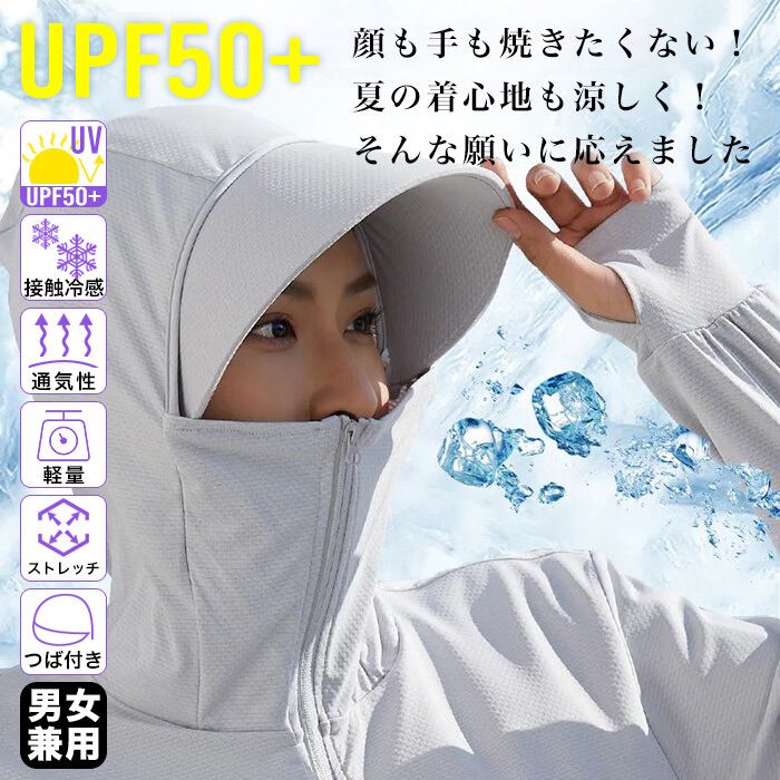 紫外線対策にSPF50+&遮光率99%のラッシュガードパーカーをお使い下さい。取り外し可能なつば付きで、前ジッパーは口元まで上がり指穴付きなのでお顔から手の甲まで日焼け対策ができます。運転やおでかけ、ランニング、リゾートや旅行はもちろんオフィスや電車での冷房対策にも!後ろのジッパーをあければ髪の毛をフードから出すこともできます。さらに!接触冷感機能付きなのも嬉しいですね。