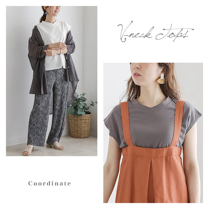 深すぎないVネックがシンプルなフレンチ袖トップス。フレンチスリーブは二の腕も程よくカバーしてくれて、1枚で着用したり、ワンピースのインナーとしてなどデイリー使いにお勧めです。