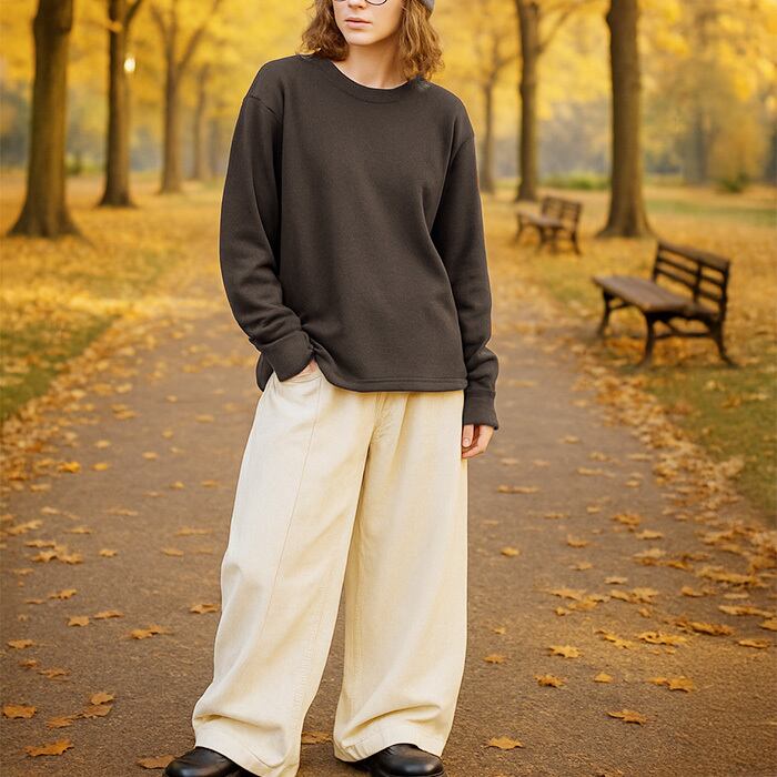 とろけるような肌触りが魅力の、とろみ素材ロングTシャツ。なめらかで落ち感のある生地&ゆったりサイズで体型カバーにも。シンプルな丸首デザインは首元をすっきりと見せ、どんなコーデにも合わせやすい万能アイテム。肌にやさしく寄り添う軽やかな着心地で、デイリー使いからおうち時間まで幅広く活躍します。少しだけ厚めのしっかりとした生地なので春秋は一枚で、冬場はカーディガンやジャケットのインナーとしても優秀。