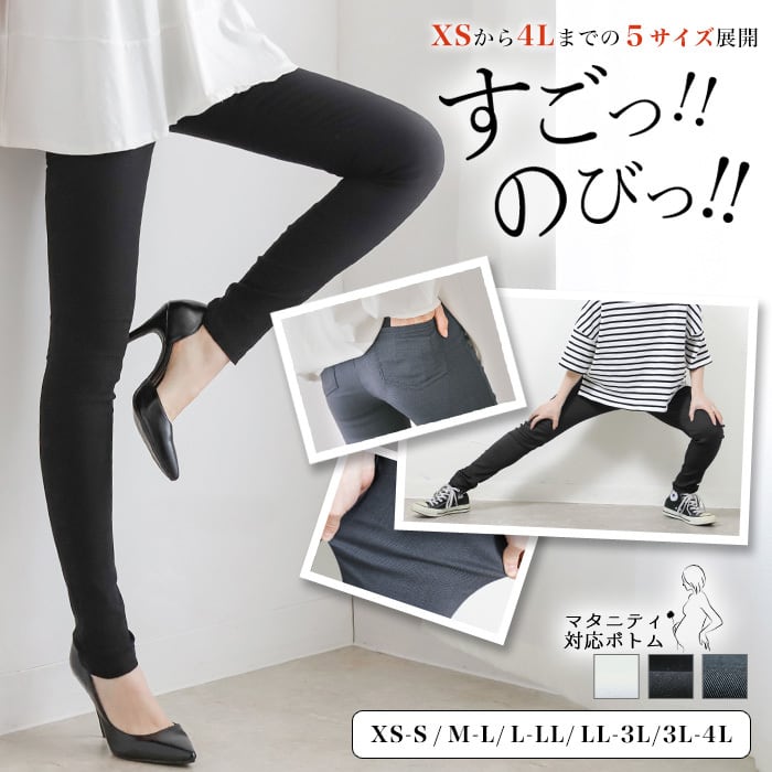 よく伸びて自分サイズにフィットするハイウエストのスキニーボトムは、XSサイズから4Lサイズの方までの選べる5サイズ展開。