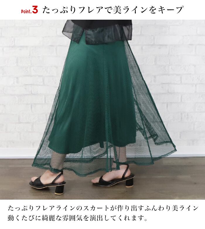 人気形状のマキシスカートに表地がトレンドのメッシュやレースのタイプが誕生しました。