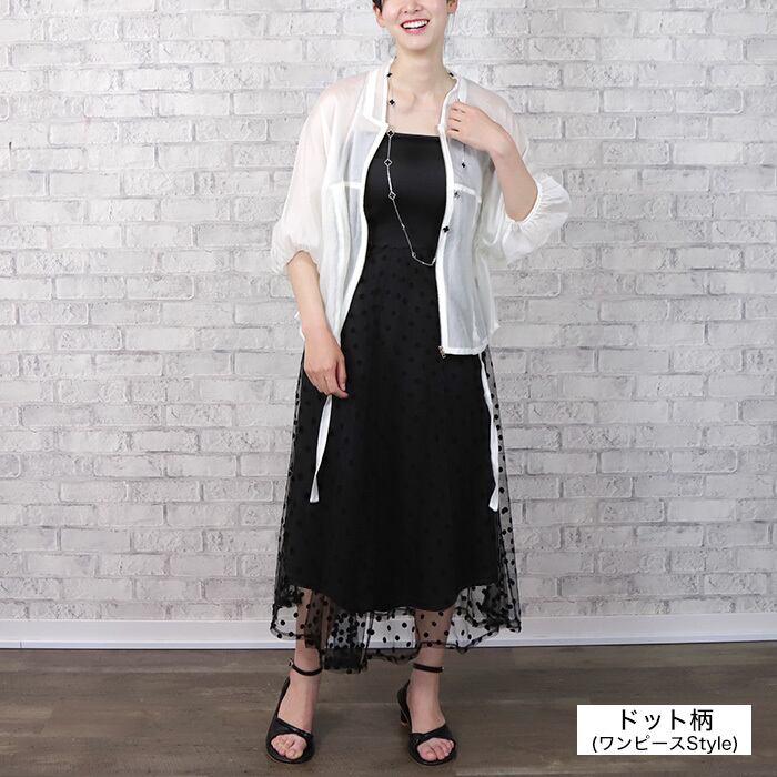 網々のメッシュ、上品なシアー感のレース、共にトレンドの透け感を華やかに楽しむことができます。